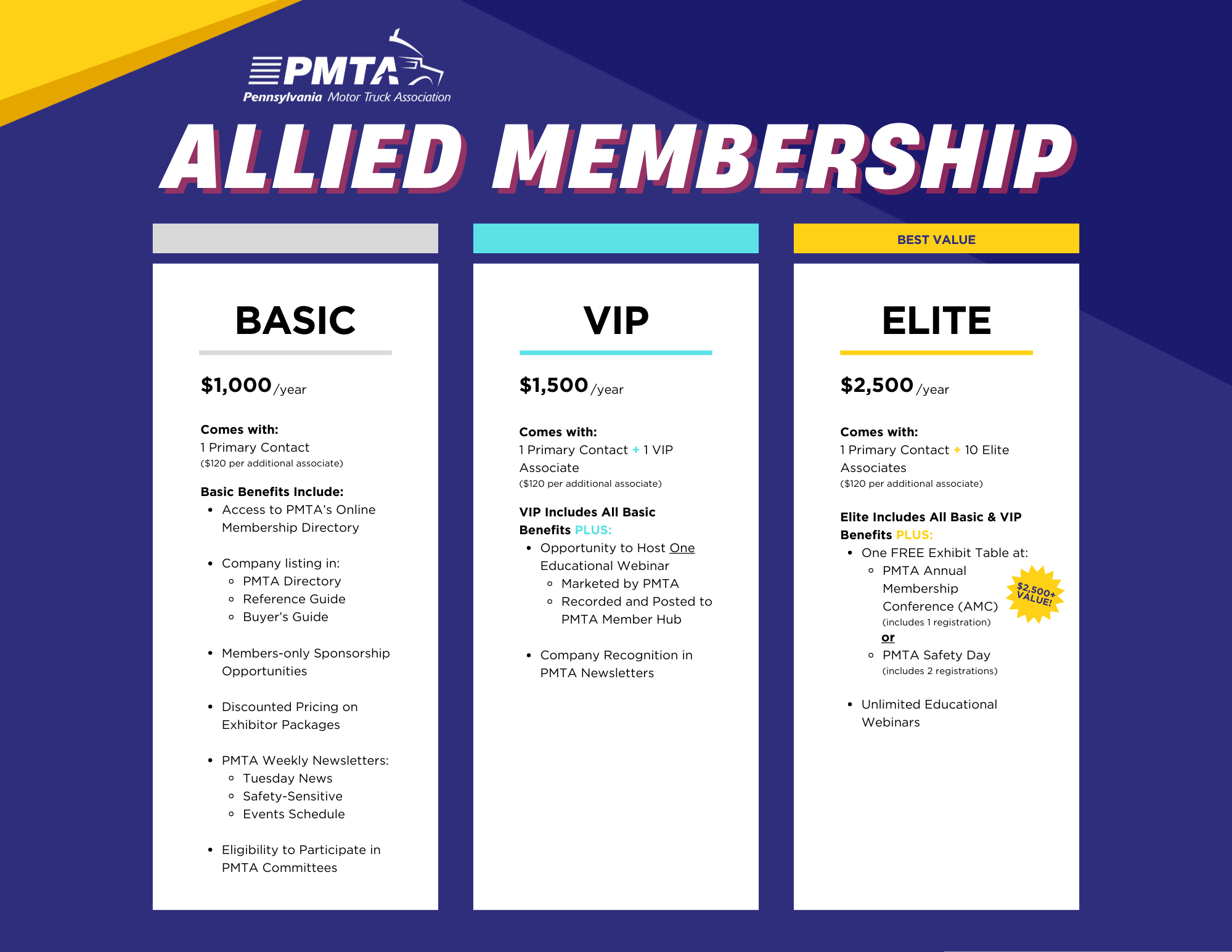 Allied partners are an essential part of the Pennsylvania Motor Truck Association. Your products, services, and expertise support the carriers that keep Pennsylvania’s economy moving — and your membership strengthens the entire network that powers our state’s trucking industry.